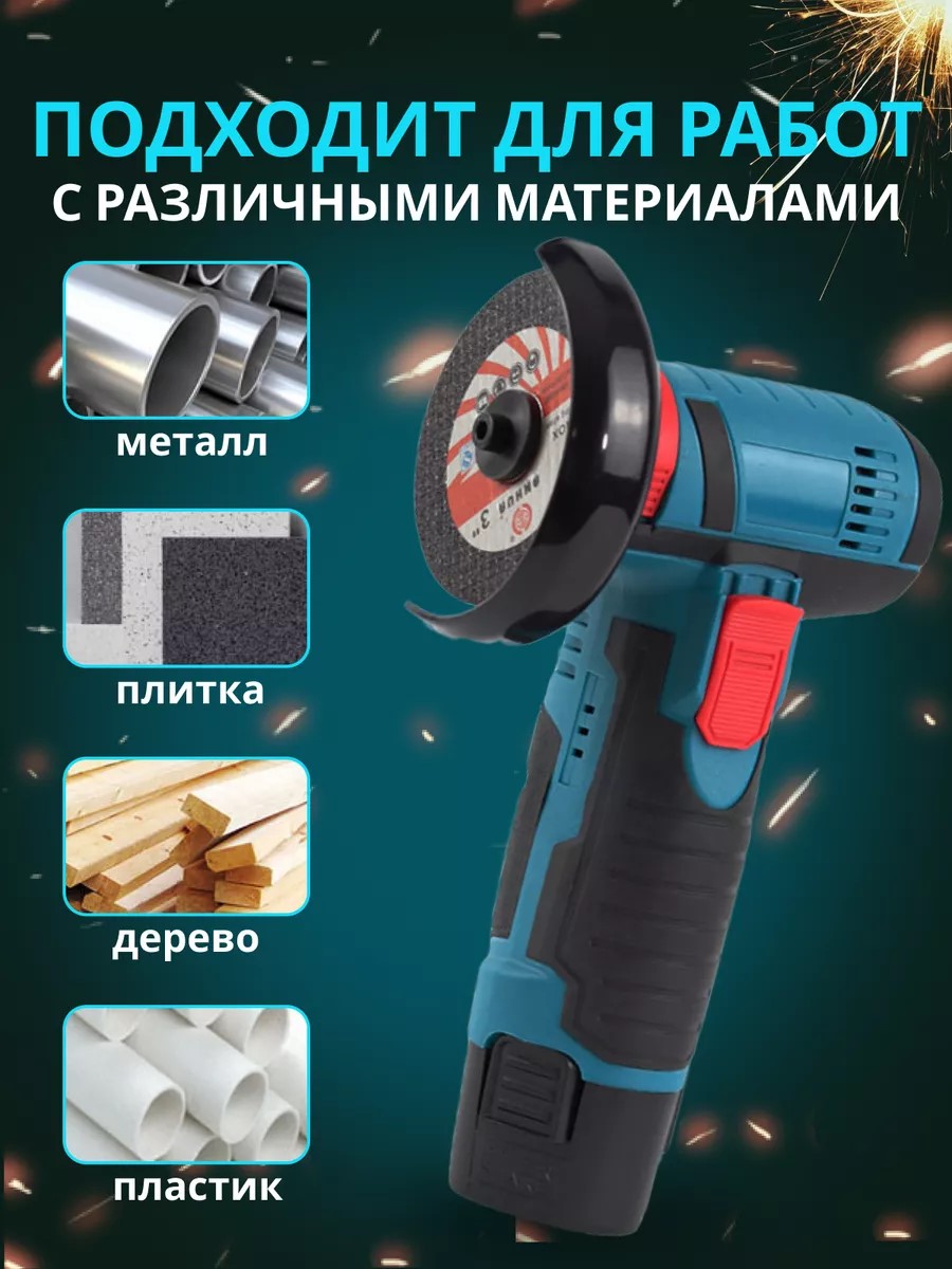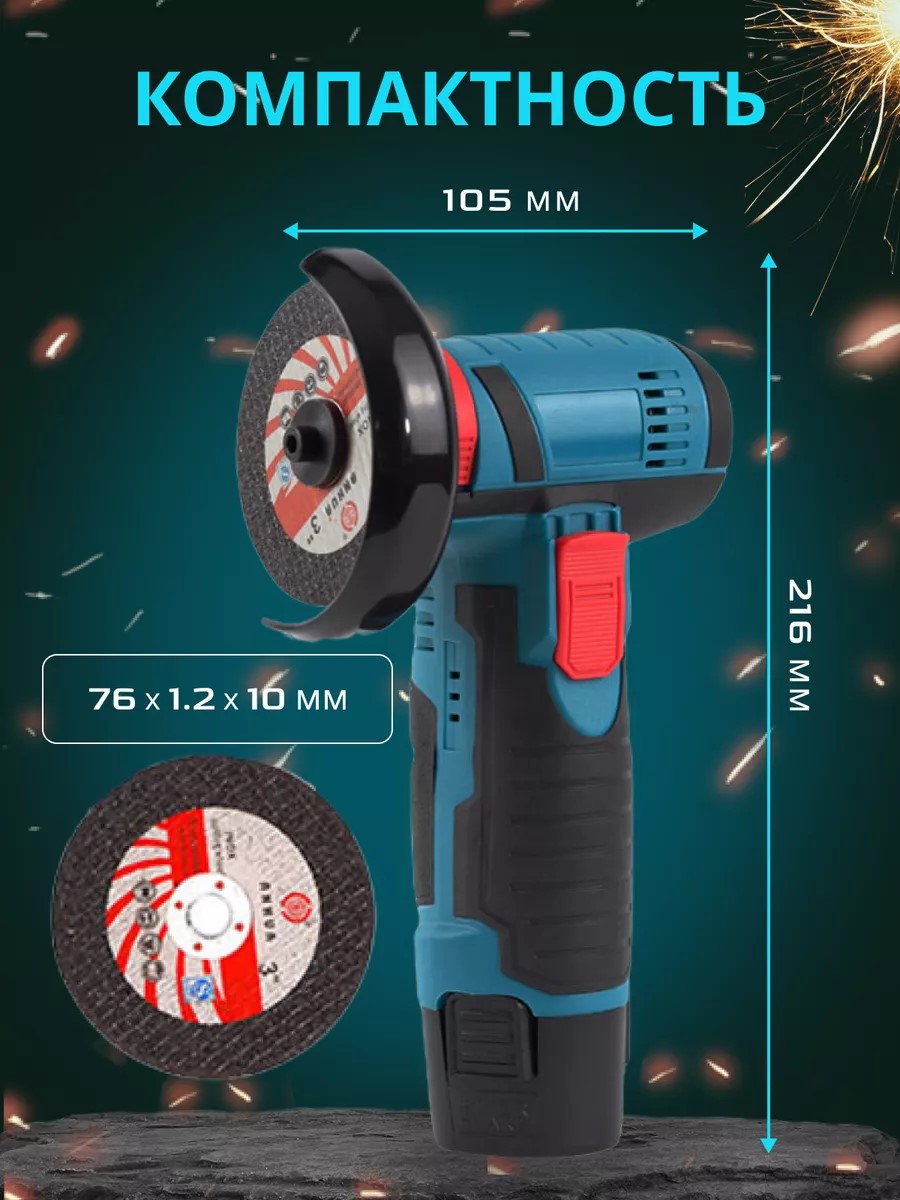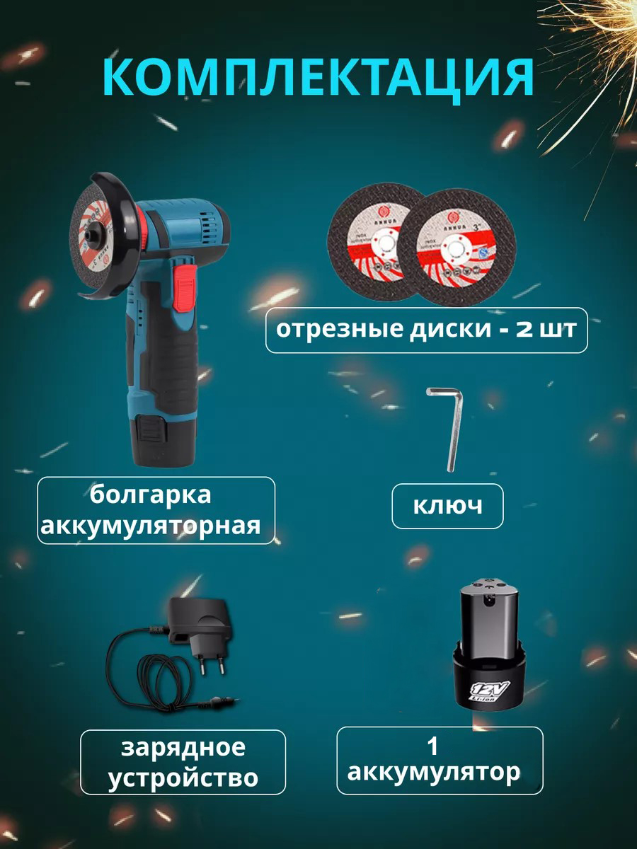 - Комплектация: мини болгарка, отрезной диск - 2 шт., ключ, зарядное устройство, аккумулятор - 1 шт.;